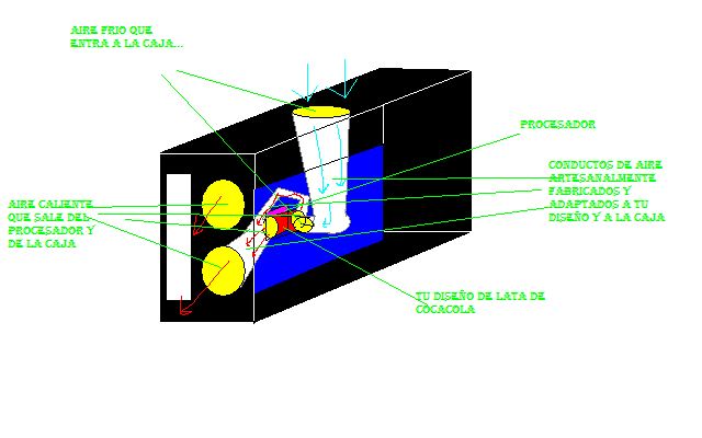 dios, esta currado si.. pero no se, las temperaturas no variaran mucho a menos que se pre-enfrie el aire que entre a la lata.. sino hara una especie de circulo vicioso, el mismo aire caliente volvera a pasar por el micro o sera absorvido por las ram`s o por la grafica que de por si sola chupa aire de cojones los venitaldores de ella... yo crearia un conducto o algo que saque el aire justo afuera de la caja y otro que se conecte al ventilador de 12cm para que salga aire de afuera de la caja, con una especie de rejilla antipolvo y otro ventilador de 12 o de mas potencia en la salida... asi se aumentara el caudal, solo te falta decir como refrijerarar las ram y la grafica para que te lleves un dragon a tu casa, si es que nadien supera tu idea claro... te centras solo en el procesador..