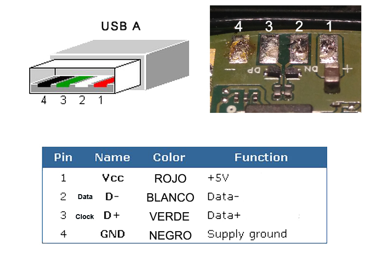 El otro extremo del cable tendremos que soldarlo al USB hembra como indica en el diagrama.