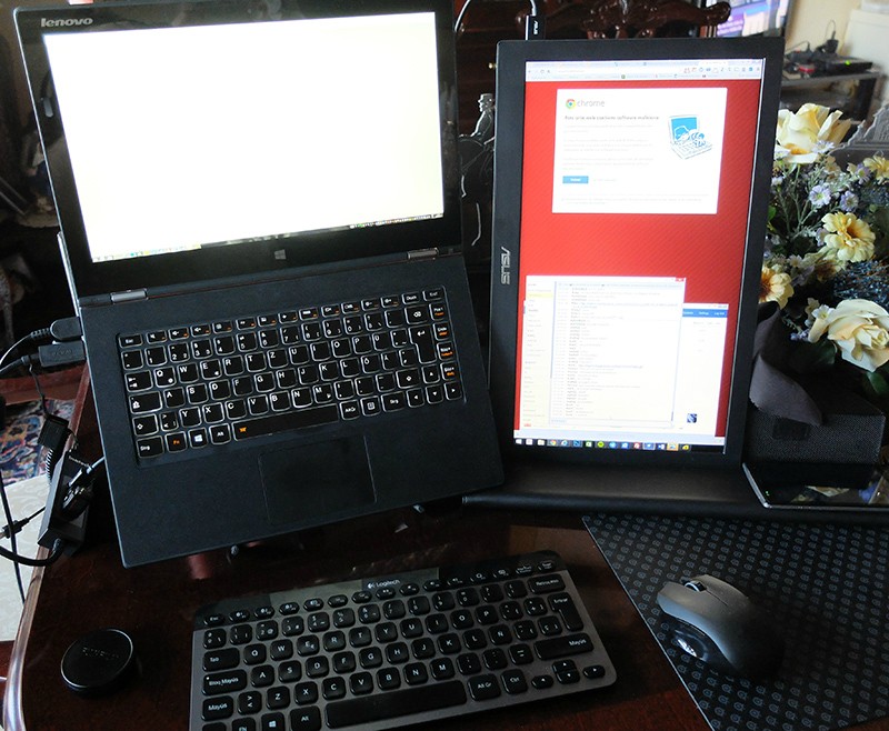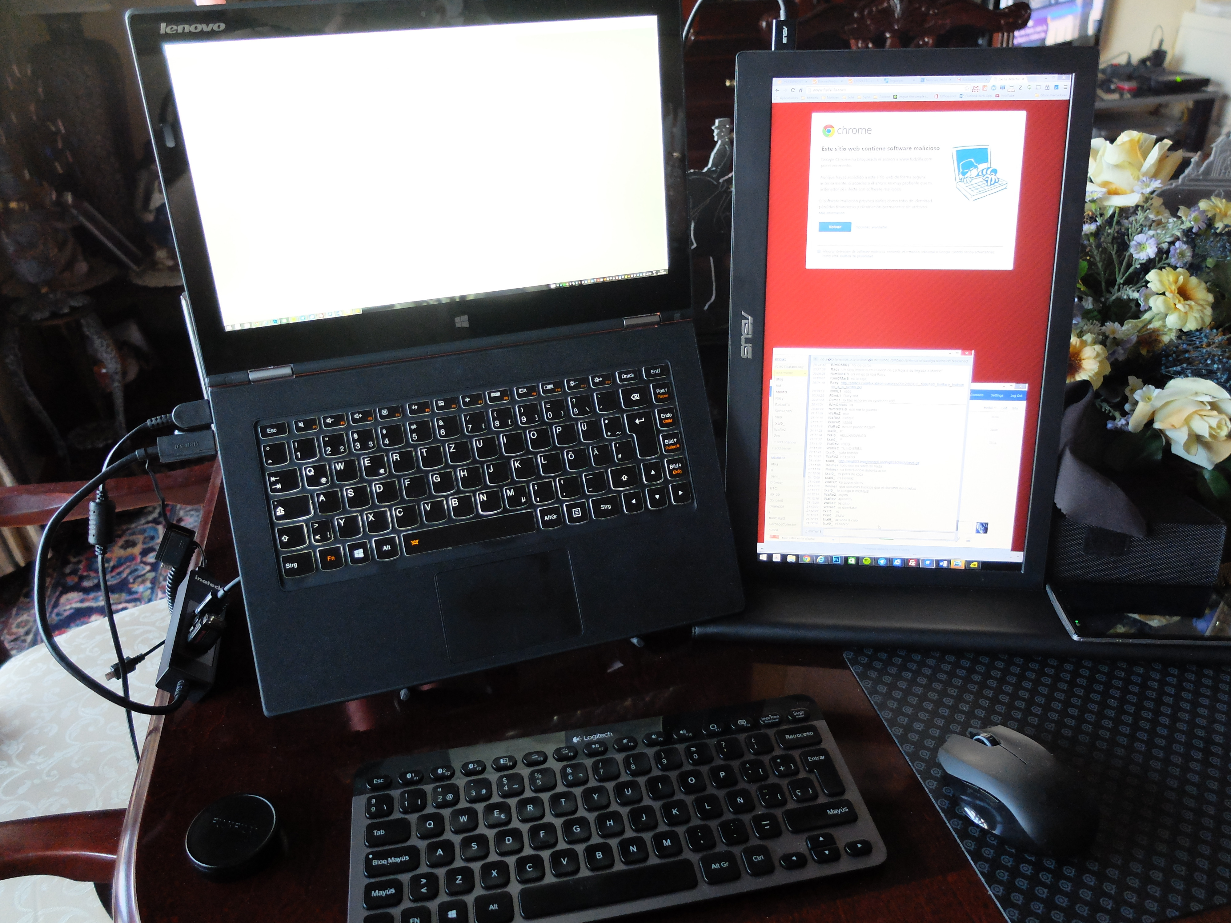 Básicamente se compone de un Lenovo Yoga 2 Pro que compre de segunda mano en Amazon.de, con teclado alemán incluido, a un precio rompedor. Una pantalla MB168B+ de ASUS, como complemento a la pantalla de 3200x1800 del Lenovo, que uso para navegación en vertical fundamentalmente.