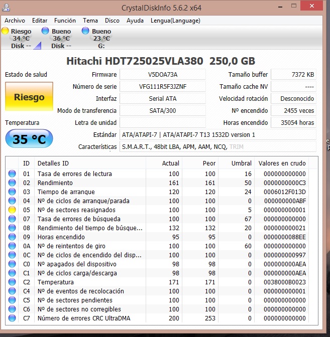 He instalado la utilidad "CrystalDiskInfo" para ver el estado de mis discos duros y en uno parece haber un riesgo en su estado de salud, pero desconozco el alcance de dicho riesgo y si se puede reparar y si puede ser el causante de mis continuos problemas: