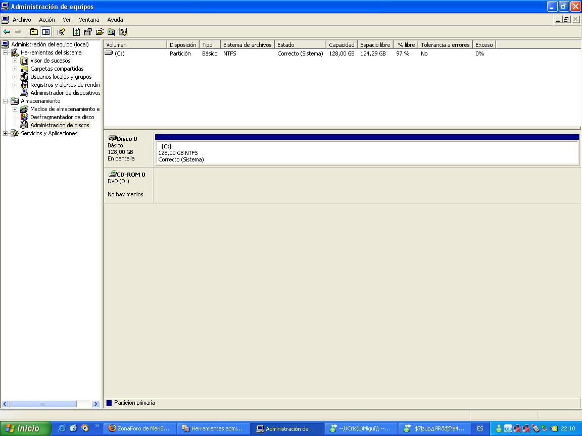 ola, tengo un pequeño problema. en mi ordenador tengo un disco duro intalado de 320gb. cuando instale por priemra vez el sistema operativo, me di cuenta de que el disco solo me marcaba 128gb, y claro, me pregunte, donde ha ido a parar el resto?? Entonces le pregunte a un amigo (zarza) y me dijo que fuera al administrador de discos o algo asi, y ahi estaba, el resto, los 170 gb y pico sin activar, entonces