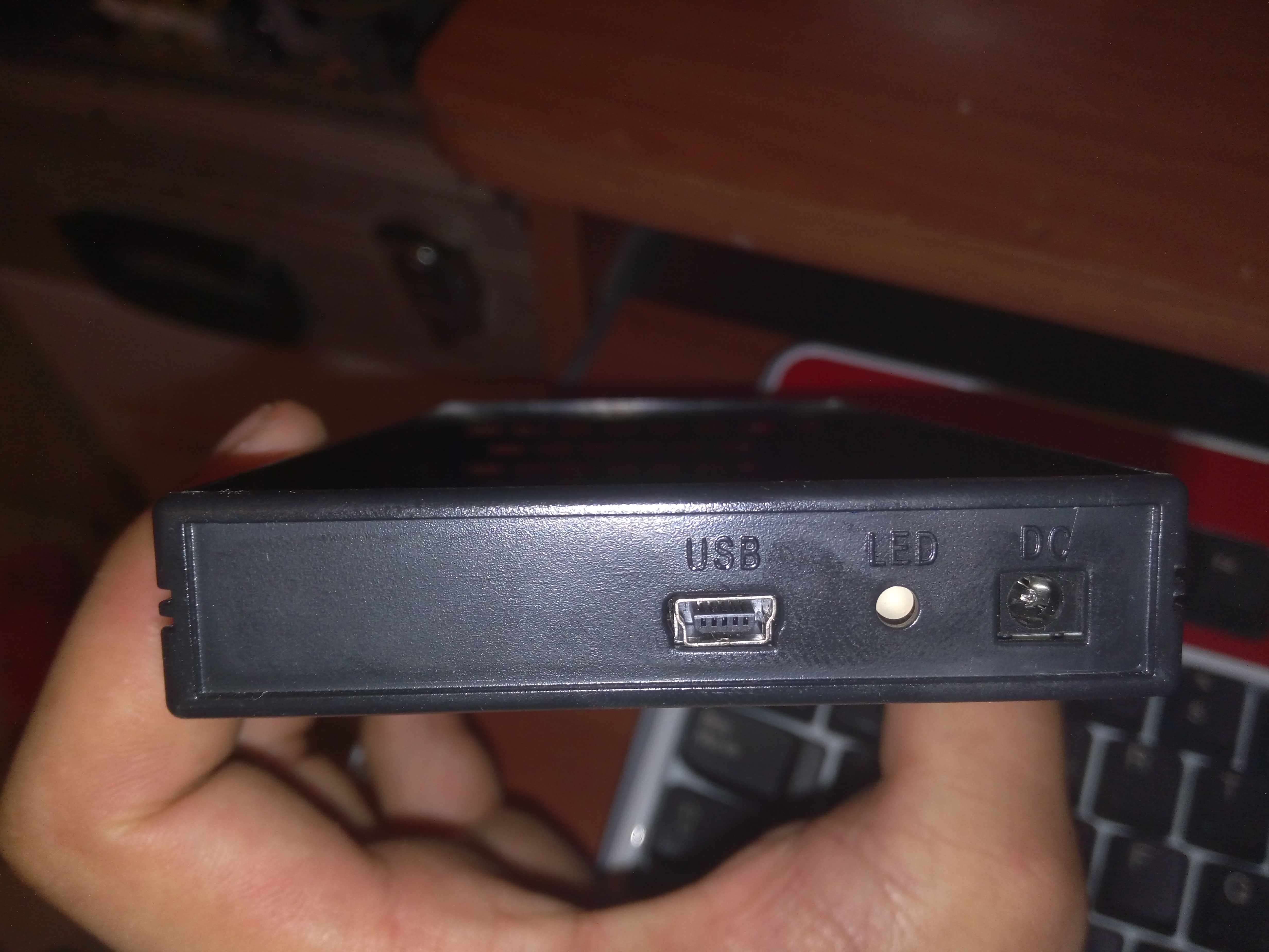 Podemos observar el conector USB, el led de estado, y una toma de corriente que, ciertamente, nadie sabe que hace ahi, ya que no aparece en el manual, ni se incluye un transformador para la caja. Por tanto, no puedo decir nada acerca de él.