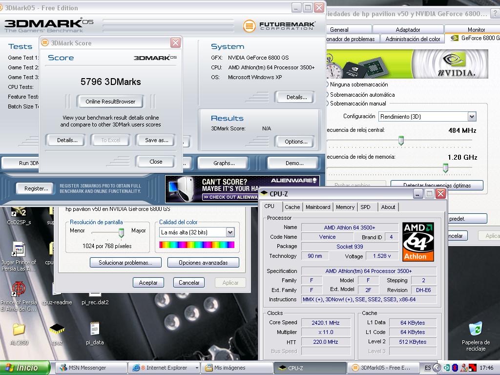 Tengo un Pentium 4 630 3.0 ghz, 1gb de ram pc3200 y una nvidia 6200 256 mb... y los resultados del 3DMARK son 905!!!