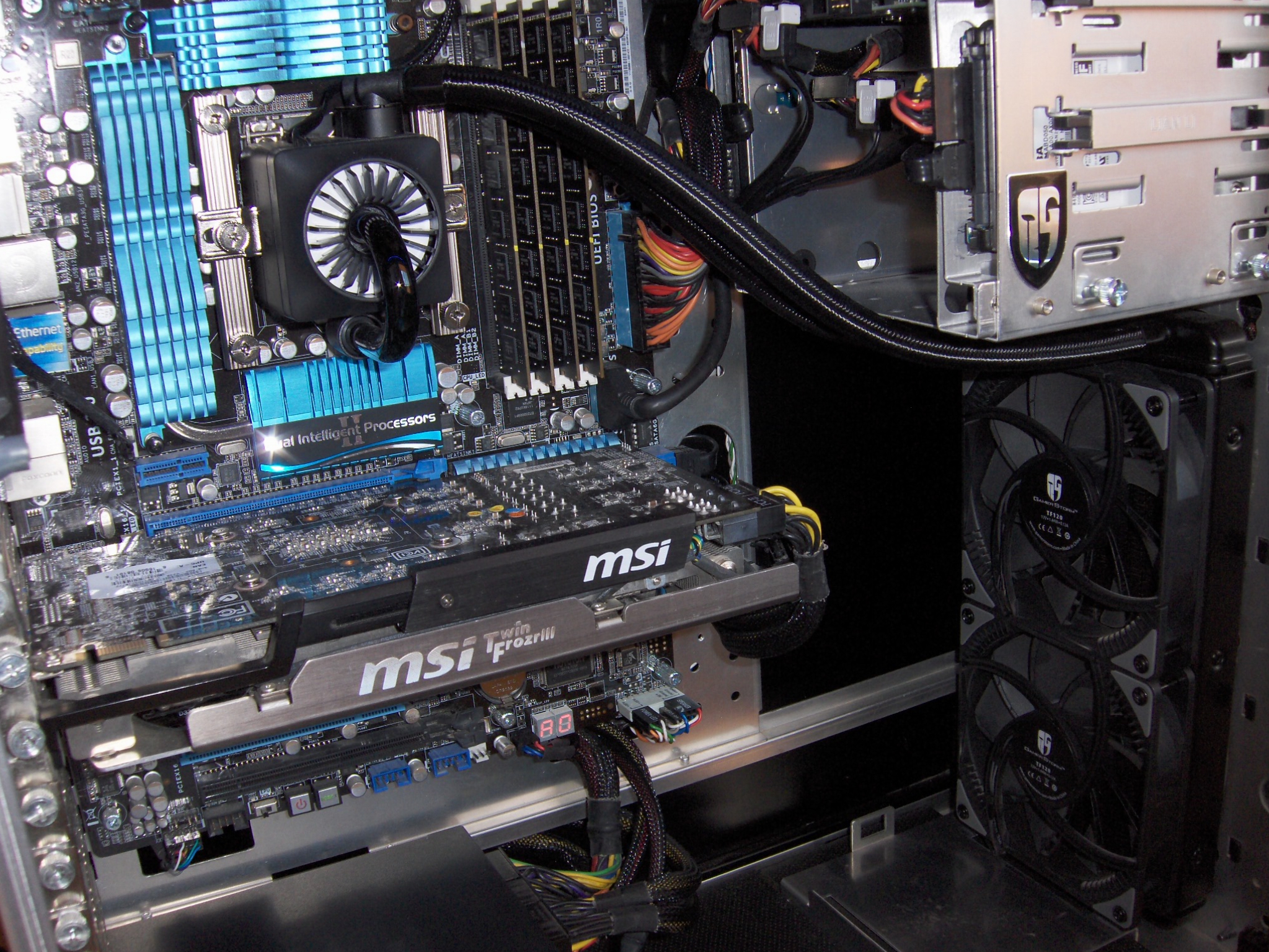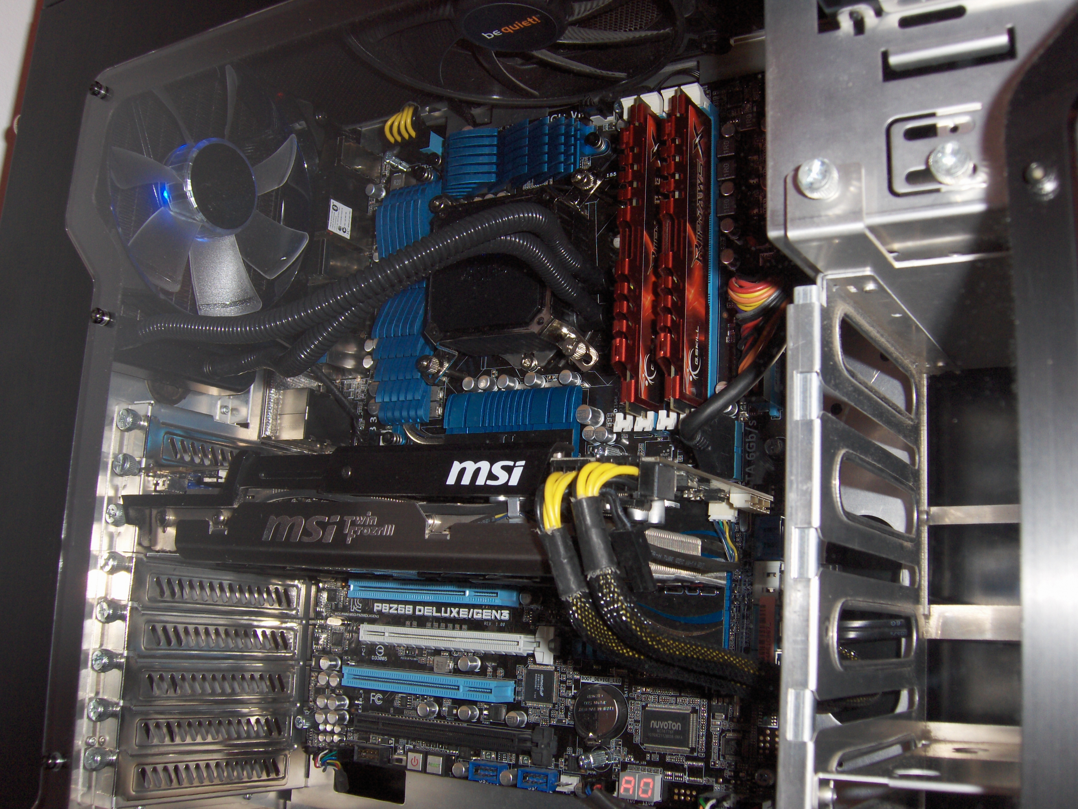 Al tener una caja antigua (2011), una Lian Li PC-9FB tuve que ingeniármelas para poder acomodar el radiador. Retiré la caja de los discos duros para instalarlo en la parte frontal e instalé un RACK de discos encima del radiador (una de las ventajas de una buena marca, siempre tienes accesorios disponibles para tus nuevas necesidades y así no tienes que cambiar de caja).