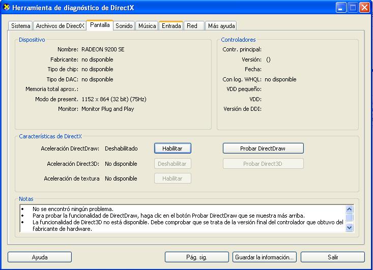 Hola amigos, tengo un problema con mi Pc lo que pasa es q io tengo una tarjeta de Video Ati Radeon 9700SE y bueno cuando quiero jugar algun juego se reinicia y tampoco puedo bajaar la resolucion de pantalla y cuando entro al DXDIAG.exe me sale un mensaje que dice DIAG a detectado que posiblemente hubo un problema al tener acceso al Direct3D la ultima ves q se uso este programa ¿Desea desviar direct3D esta ves? y hay pa decir SI o No si le doy la opcion que SI normal corre el programa okis y si le doy la opcion NO se reinicia y bueno io le doy SI px y en la Ficha donde dice Pantalla en donde dice Aceleracion de DirectDraw esta desabilitado px y bueno io le doy habilitar pero no surge efecto, tambien ahi mismo dice aceleracion Direct3D esta desabilitado y aceleracion de Textura dice no Disponible.. bueno quisera q me expliquen xq no puedo correr juegos en mi PC o si esta mal mi tarjeta de Video.. muchas gracias amigos aqui les dejo la foto
