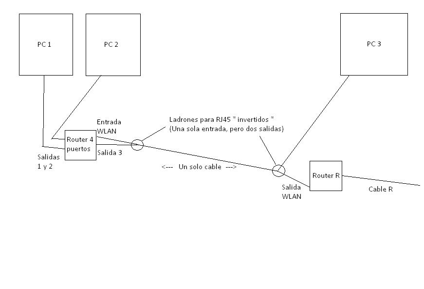 Se me ocurrio una idea para que los 3 pcs vayan directamente conectados a mi router de 4 puertos, pero para eso, el cable que va del router de R al mio de 4 puertos, tendria que ser el mismo que el que va desde mi router hasta el pc de la otra habitacion, en definitiva, os hice un pequeño dibujo en paint para que os aclareis de lo que pretendo hacer, aunque me parece que no es posible que un mismo cable haga la funcion de WLAN y de salida a un pc a la vez poniendo unos ladrones para RJ45.