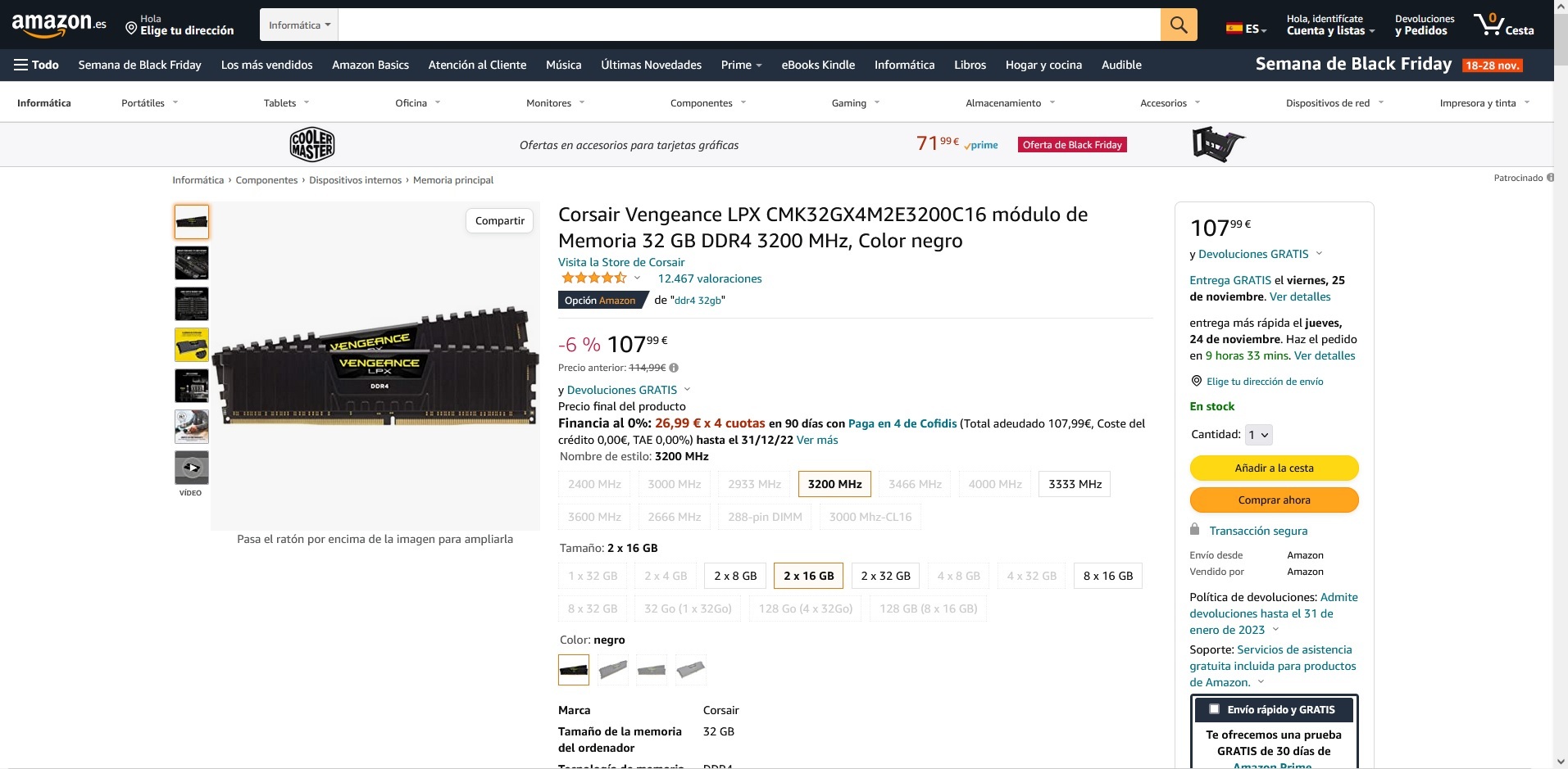 RAM: Corsair Vengeance LPX 32GB (2x16) DDR4 3200 MHz CL16, 114.99€ Amazon