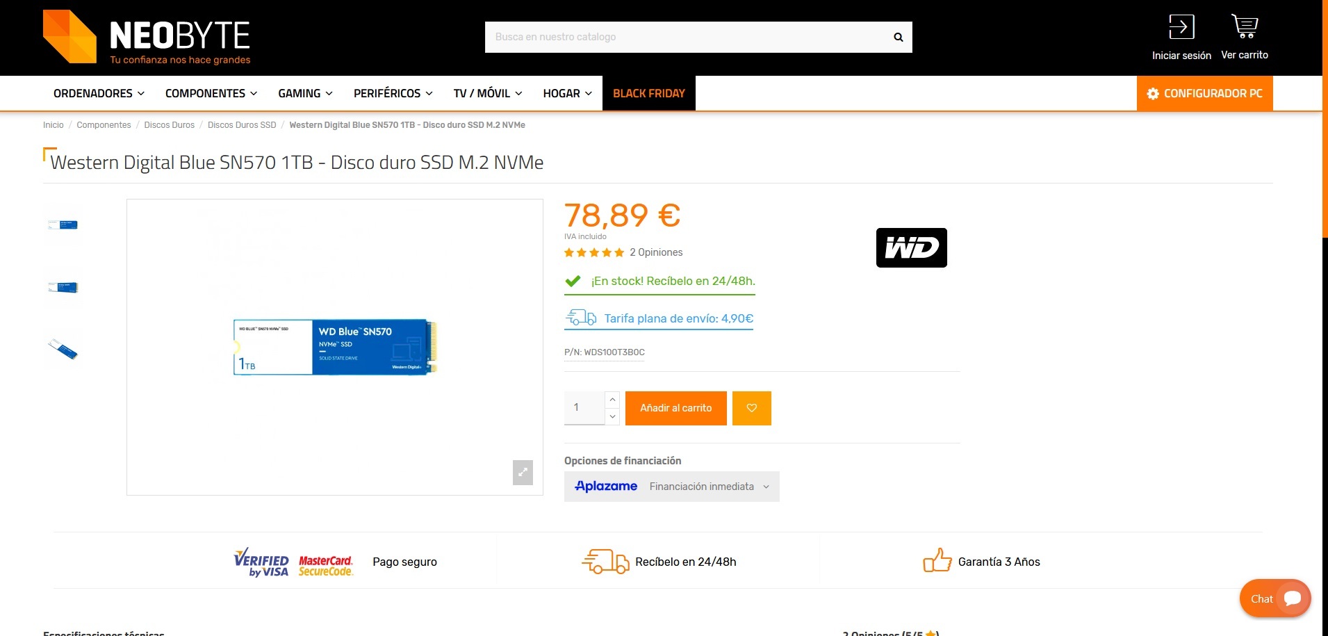 Almacenamiento: Western Digital Blue SN570 1TB, 78.89€ Neobyte