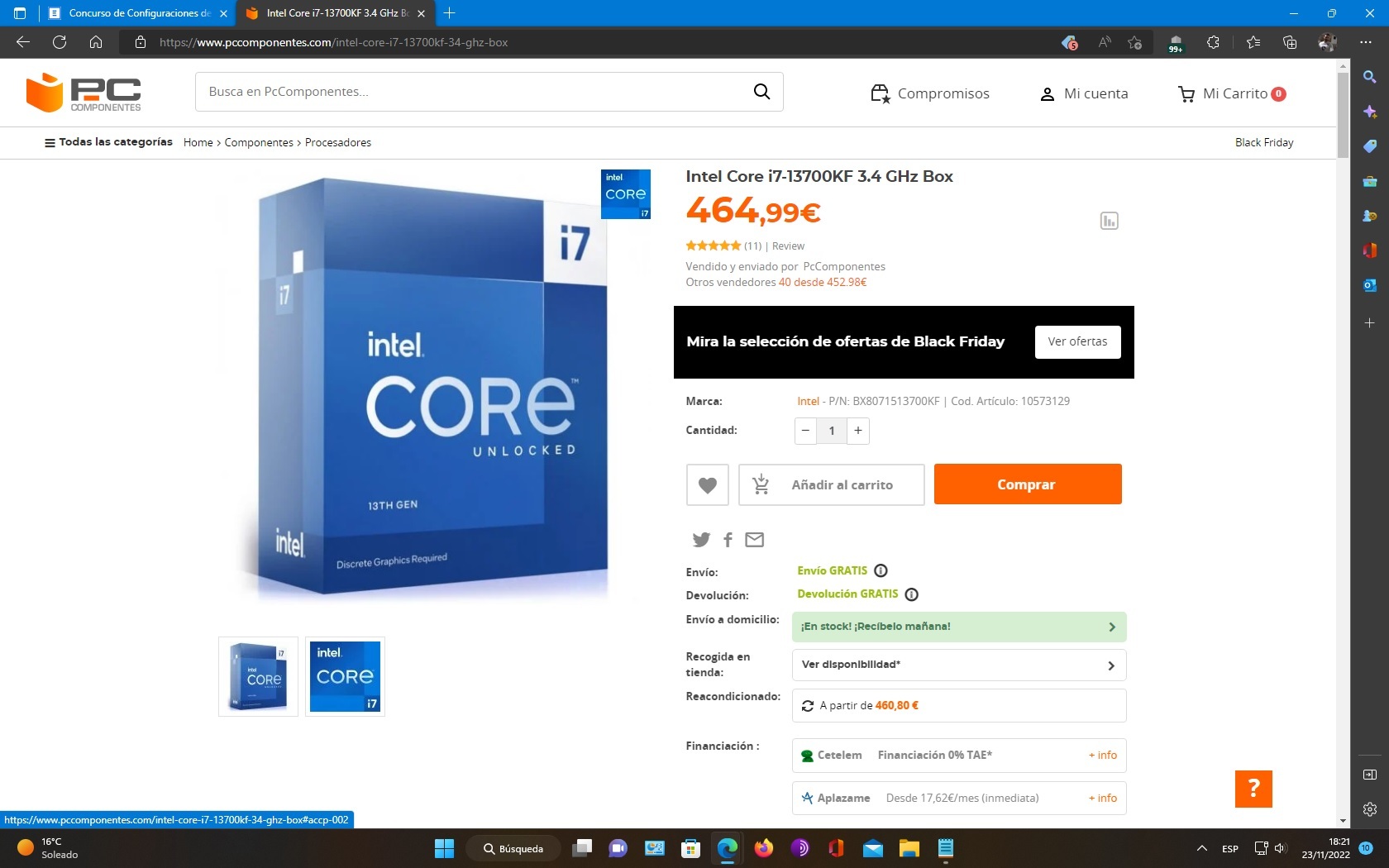 CPU: Intel i7 13700KF 464,99€ PCcomponentes