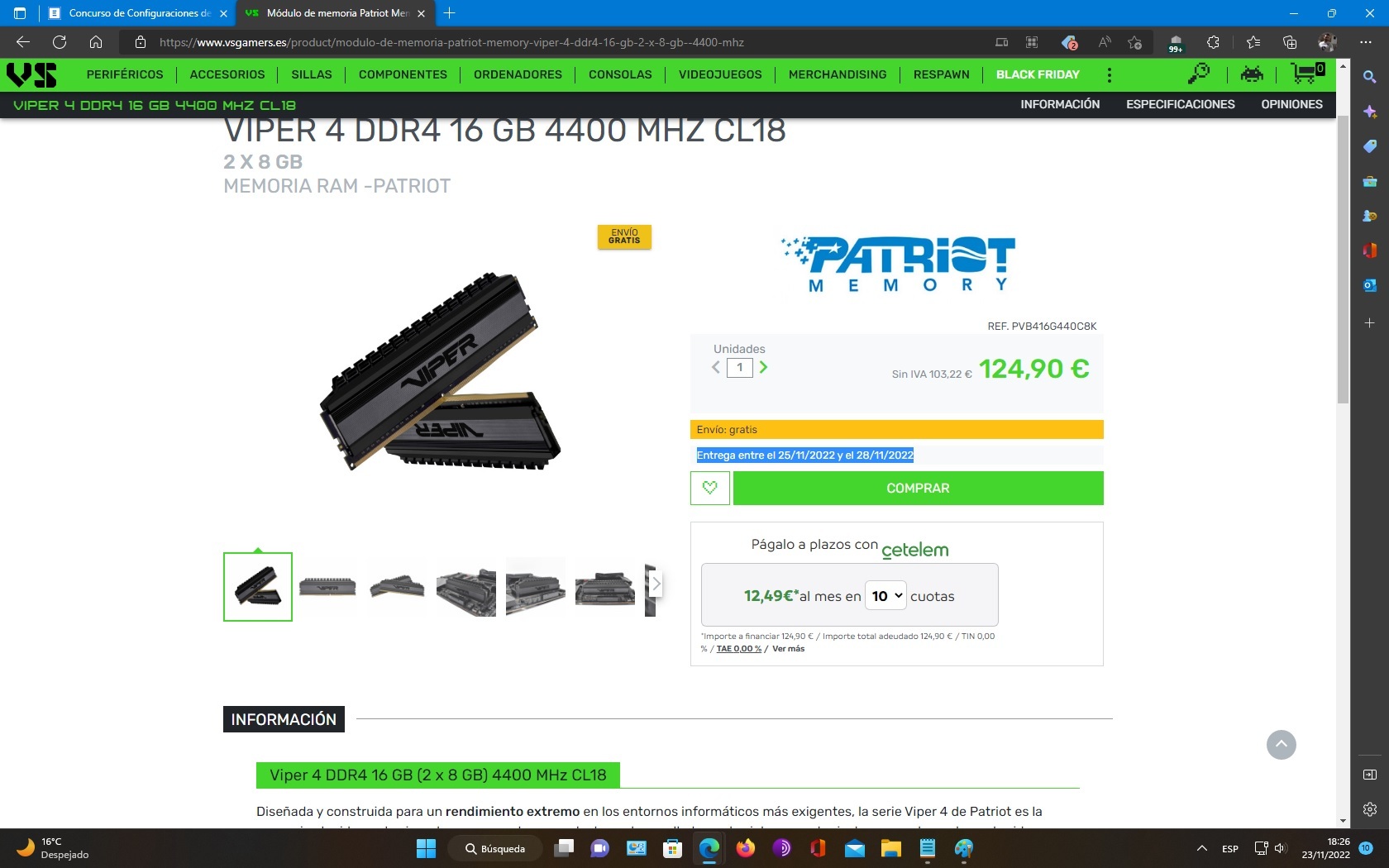 Memoria principal: Viper 4 DDR4 2x8GB 4400mhz CL18 124,90€ VSgamers