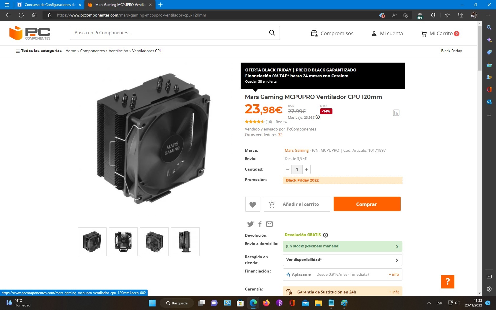 Disipador: Mars Gaming MCPUPRO 27,99€ (incluye pasta térmica) PCcomponentes