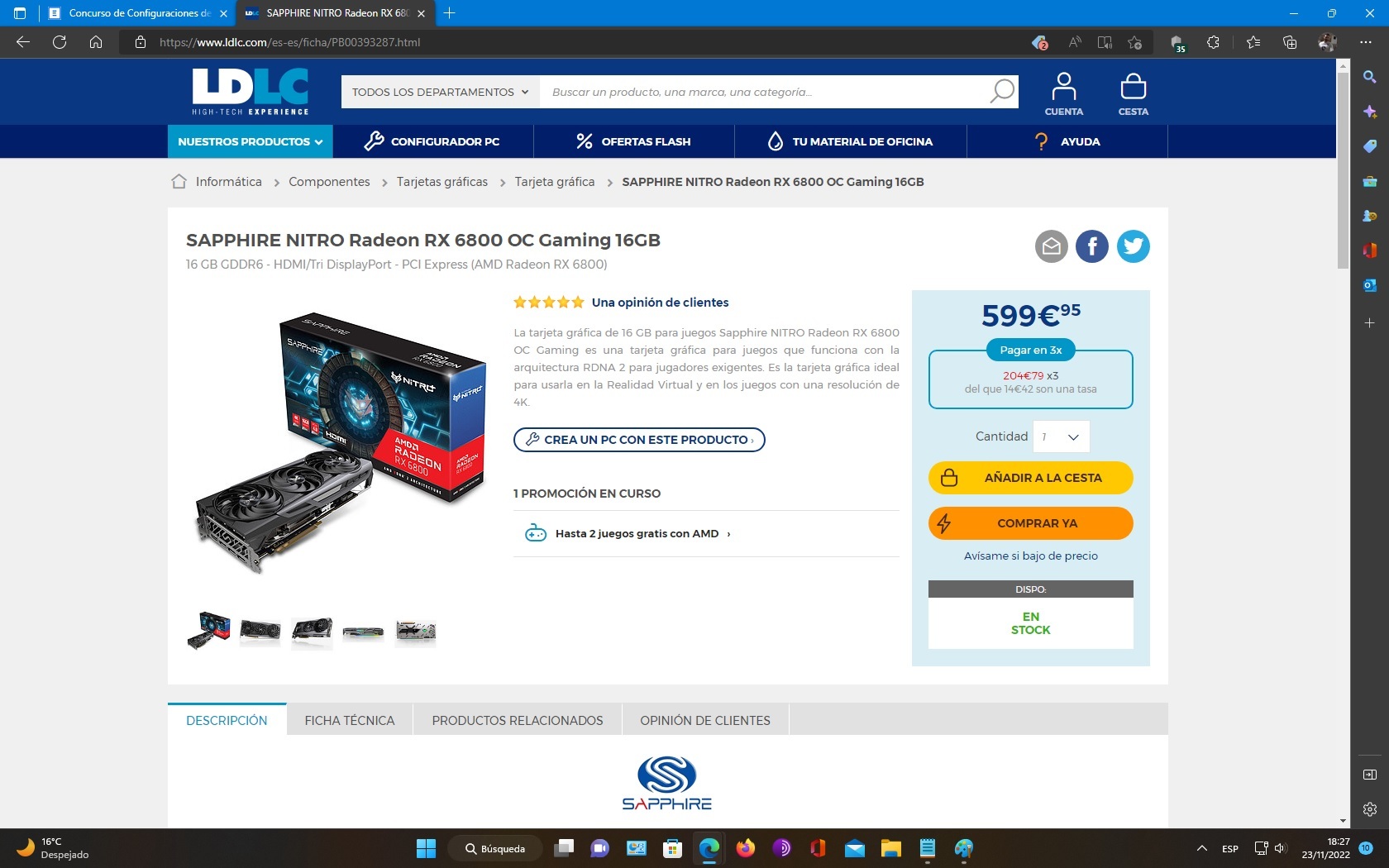 GPU: Sapphire nitro radeon rx 6800 oc gaming 16GB 599,95€ LDLC