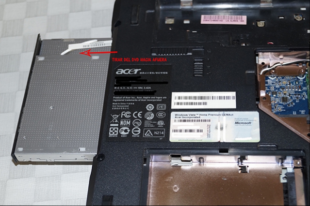 Para continuar vamos a sacar el Lector de DVD, para ello soltaremos el tornillo que lo sujeta, y tiraremos del Lector del DVD hacia afuera con cuidado para sacarlo.