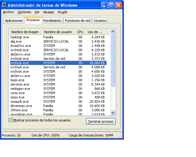 Mirando en el Administrador de tareas, vi que un proceso llamado Svchost.exe era el causante, ocupando el 100% del uso de la CPU. Investigué por internet y lei exactamente 2 soluciones para este problema Solucion al problema svchost.exe - Taringa! y ninguna me funciona, ya que la actualizacion me sale este error del sistema: