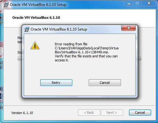 Buen dia, les agradeceria mucho si ustedes pueden hacerme el favor de ayudar a solucionar un problema a la hora de instalar una programa ejecutable, mas exactamente el programa virtualbox, e igualmente VMware, el problema que arroja es el que dejo en la imagen: "error reading from file" y el siguiente "instalation failed: error irrecuperable durante la instalacion.