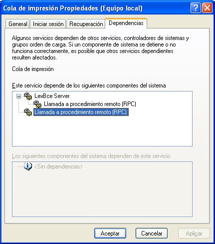 Para elimar el problema de la dependencia que nos estorba (LEXBCES): inicio -> ejecutar -> regedit -> HKEY_LOCAL_MACHINE\SYSTEM\CurrentControlSet\Services\Spooler\DependOnService